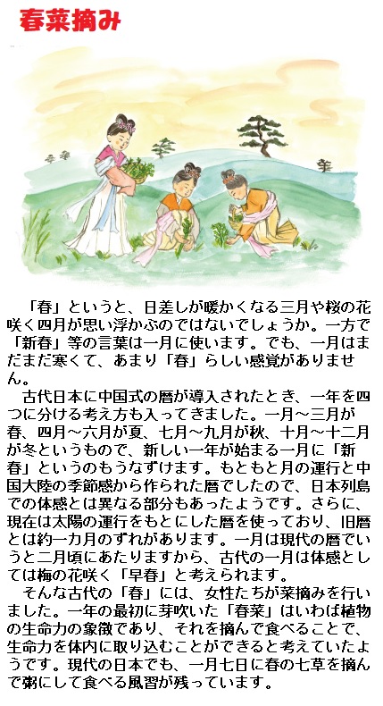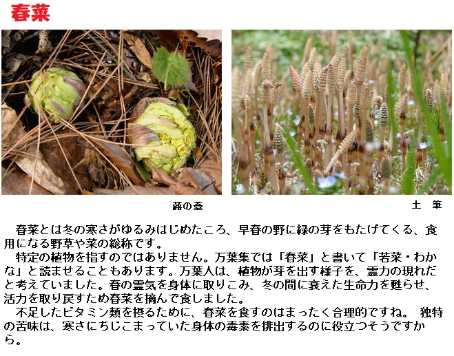春菜(はるな)もしくは若菜(わかな)は、春になって目を出す菜の類を言います。昔の人は春に「若菜摘み」をし、不老不死を願って食べたようです。