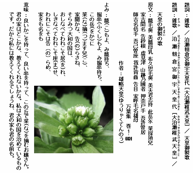 巻1-0001: 篭もよみ篭持ち堀串もよみ堀串持ちこの岡に菜摘ます子.......(長歌)