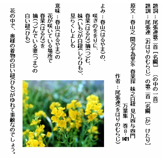 巻8-1421: 春山の咲きのををりに春菜摘む妹が白紐見らくしよしも