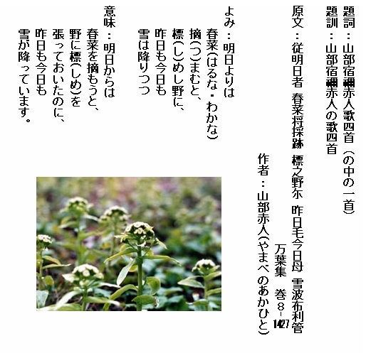 巻8-1427: 明日よりは春菜摘まむと標めし野に昨日も今日も雪は降りつつ