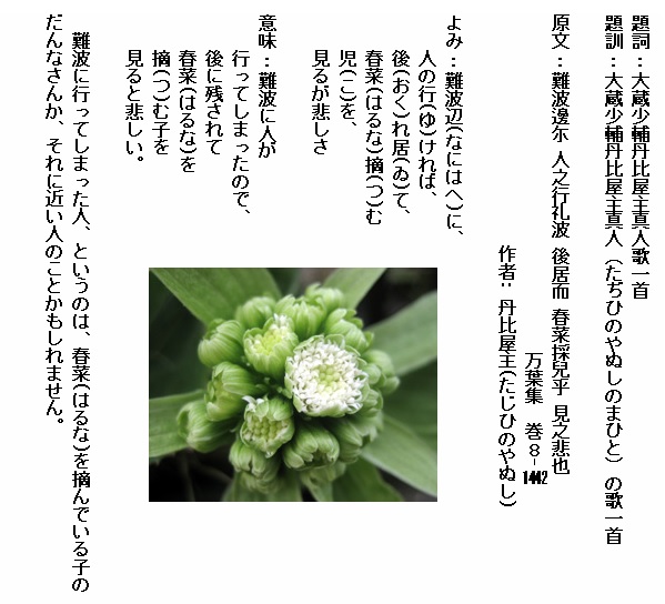 巻8-1442: 難波辺に人の行ければ後れ居て春菜摘む子を見るが悲しさ