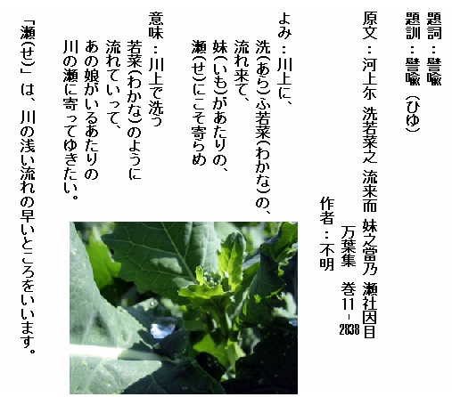 巻11-2838: 川上に洗ふ若菜の流れ来て妹があたりの瀬にこそ寄らめ