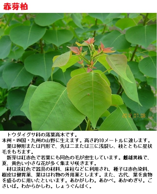 ひさぎは、トウダイグサ科アカメガシワ属の落葉高木の赤芽柏(あかめわしわ)と考えられています。初春の新芽が赤くて美しいのが特徴です。また、昔はこの葉をカシワと同じように食物をのせるのに用いたことから「赤芽柏」の名がついたとのことです。