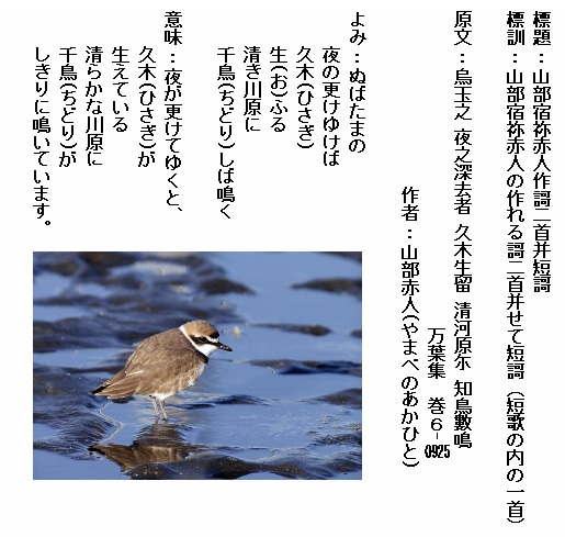 巻6-0925: ぬばたまの夜の更けゆけば久木生ふる清き川原に千鳥しば鳴く