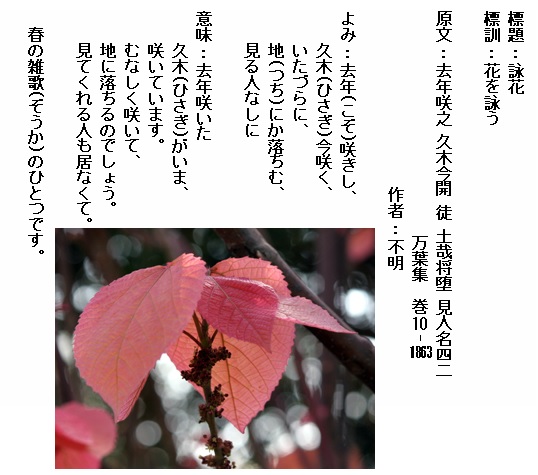 巻10-1863: 去年咲きし久木今咲くいたづらに地にか落ちむ見る人なしに