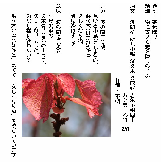 巻11-2753: 波の間ゆ見ゆる小島の浜久木久しくなりぬ君に逢はずして