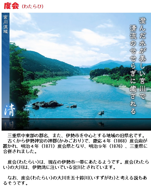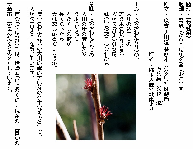 巻12-3127: 度会の大川の辺の若久木我が久ならば妹恋ひむかも