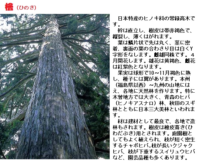 檜(ひ)/桧(ひ)は、今のヒノキ科の常緑高木の檜(ひのき)のことです。雌雄同株で、春に花が咲き、秋に球形の果をつけます。昔から建築材料として使われてきました。