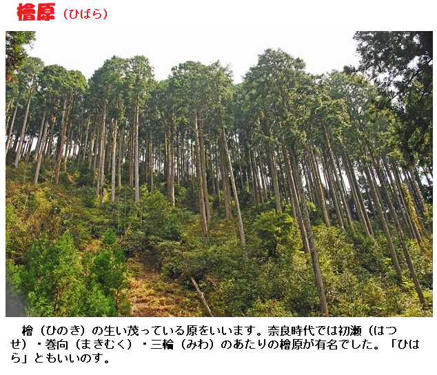 檜(ひ/ひのき)が多い場所を、檜原/桧原(ひはら)と呼んでいて(一部は地名化していたようです)、6首に詠みこまれています。
