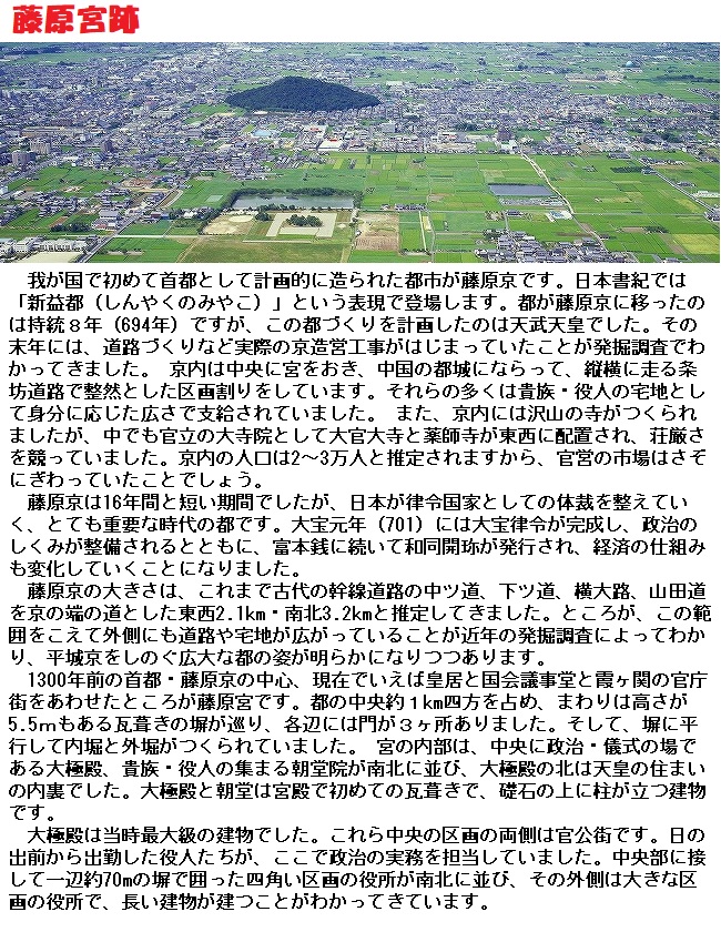 注訓:右は、日本紀に曰はく「朱鳥七年癸巳の秋八月に、藤原宮の地に幸(いでま)す。八年甲午春正月に、藤原宮に幸(いでま)す。冬十二月庚戌の朔乙卯に、居を藤原宮に遷(うつ)せり」と云へり。