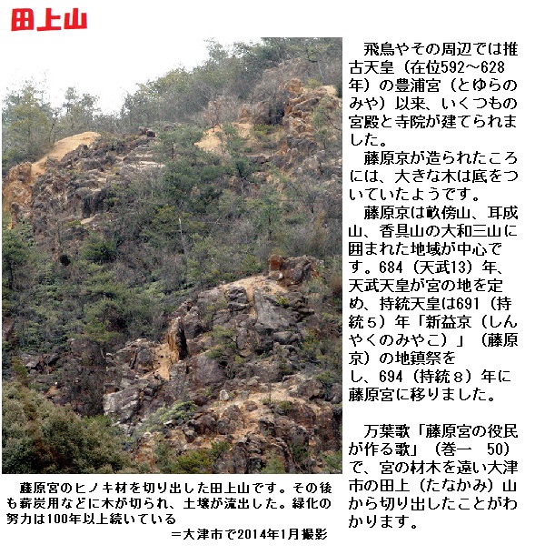 原文:八隅知之 吾大王 高照 日乃皇子 荒妙乃 藤原我宇倍尓 食國乎 賣之賜牟登 都宮者 高所知武等 神長柄 所念奈戸二 天地毛 縁而有許曽 磐走 淡海乃國之 衣手能 田上山之 真木佐苦 檜乃嬬手乎 物乃布能 八十氏河尓 玉藻成 浮倍流礼 其乎取登 散和久御民毛 家忘 身毛多奈不知 鴨自物 水尓浮居而 吾作 日之御門尓 不知國 依巨勢道従 我國者 常世尓成牟 圖負留 神龜毛 新代登 泉乃河尓 持越流 真木乃都麻手乎 百不足 五十日太尓作 泝須郎牟 伊蘇波久見者 神随尓有之