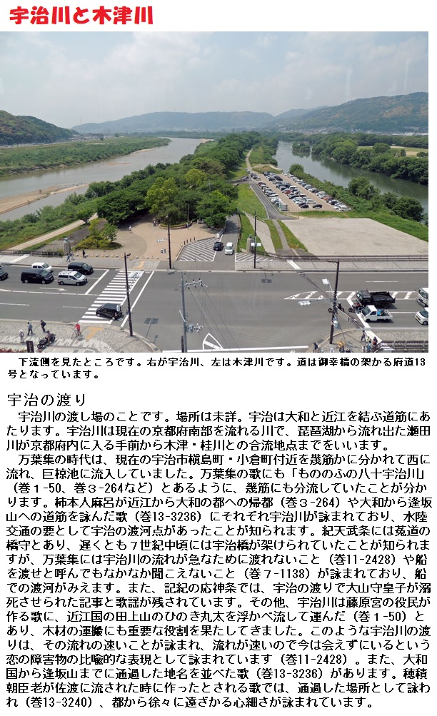 意味:天下をあまねく統治される我が大王の天まで威光を照らす日の皇子が、新しい藤原の地で統治する国を治めようと王宮を御建てになろうと現御神としてお思いになられると、天神も地祇も賛同しているので、岩が河を流れるような淡海の国の衣手の田上山の立派な檜を切り出した太い根元の木材を川に布を晒すように川一面に沢山、宇治川に玉藻のように浮かべて流すと、それを取り上げようと立ち騒ぐ民の人々は家のことを忘れ、自分のことも顧みずに、水に浮かぶ鴨のように水に浮かんでいて自分たちが造る、その天皇の王宮に人も知らない遥か彼方の国から通ってくる、その巨勢の道から我が国は永遠に繁栄すると甲羅に示した神意の亀もやってくる。新しい時代と木津川に宇治川から持ち越してきた立派な木材を百(もも)には足りないが五十(いか)のその筏に組んで川を上らせる。民の人々が勤勉に働く姿を見ると、これも現御神であることらしい。