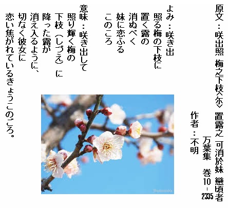 巻10-2335: 咲き出照る梅の下枝に置く露の消ぬべく妹に恋ふるこのころ