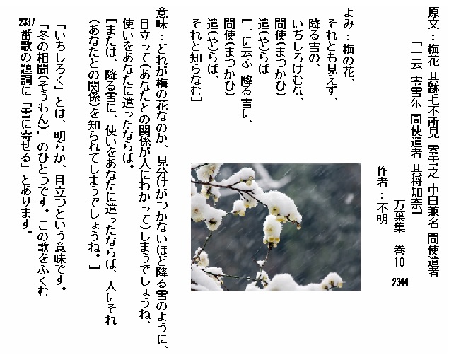 巻10-2344: 梅の花それとも見えず降る雪のいちしろけむな間使遣らば