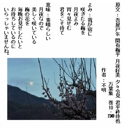 巻10-2349: 我が宿に咲きたる梅を月夜よみ宵々見せむ君をこそ待て
