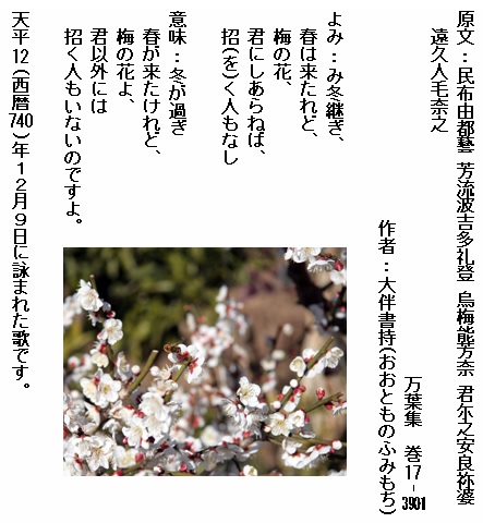巻17-3901: み冬継ぎ春は来たれど梅の花君にしあらねば招く人もなし