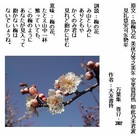 巻17-3902: 梅の花み山としみにありともやかくのみ君は見れど飽かにせむ