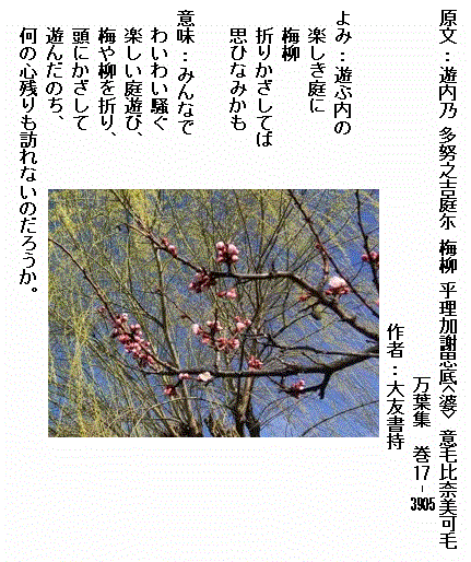 巻17-3905: 遊ぶ内の楽しき庭に梅柳折りかざしてば思ひなみかも