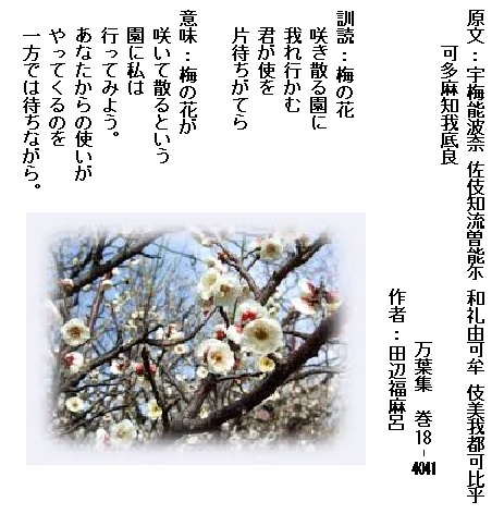 巻18-4041: 梅の花咲き散る園に我れ行かむ君が使を片待ちがてら