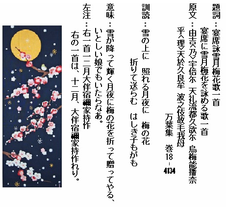 巻18-4134: 雪の上に照れる月夜に梅の花折りて送らむはしき子もがも