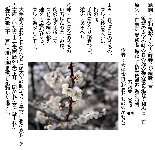 巻19-4174: 春のうちの楽しき終は梅の花手折り招きつつ遊ぶにあるべし