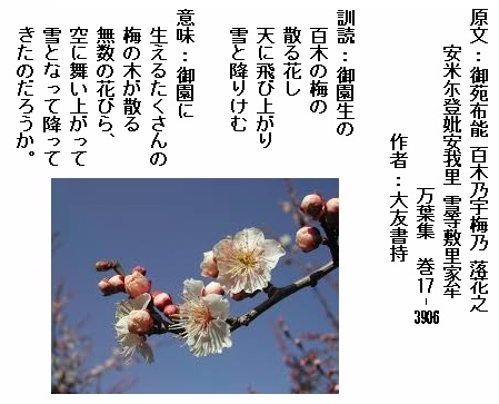 巻17-3906: 御園生の百木の梅の散る花し天に飛び上がり雪と降りけむ