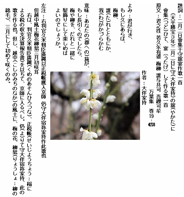巻19-4238: 君が行きもし久にあらば梅柳誰れとともにか我がかづらかむ