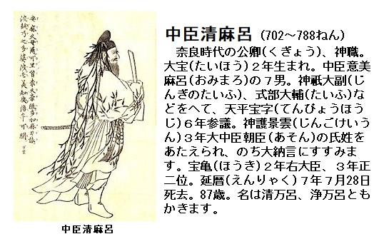 生没年不明。奈良時代の廷臣。房前(ふささき)の4男。天平12(740)年従五位下、天平勝宝元(749)年参議、翌年遣唐使となり、同4年副使吉備真備 (きびのまきび)らとともに玄宗皇帝に謁し帰国の途中、暴風にあい安南に漂着、阿倍仲麻呂と長安に戻り、唐朝に仕え特進秘書監となりました。日本の朝廷では清河を帰国させるために使者をつかわしましたが、安史の乱に妨げられて帰国できませんでした。宝亀8(777)年、次の遣唐使が入唐したときも勅して清河に帰国を促しましたが、帰りませんでした。