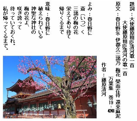 巻19-4241: 春日野に斎く三諸の梅の花栄えてあり待て帰りくるまで