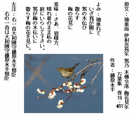 巻19-4277: 袖垂れていざ我が園に鴬の木伝ひ散らす梅の花見に