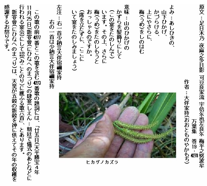 巻19-4278: あしひきの山下ひかげかづらける上にやさらに梅をしのはむ