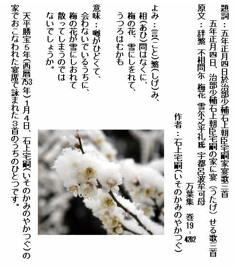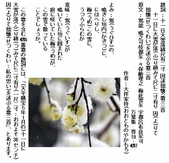 巻19-4287: 鴬の鳴きし垣内ににほへりし梅この雪にうつろふらむか