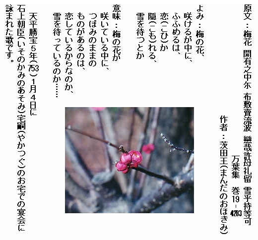 巻19-4283: 梅の花咲けるが中にふふめるは恋か隠れる雪を待つとか