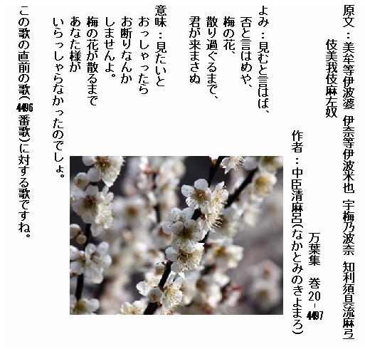 巻20-4497: 見むと言はば否と言はめや梅の花散り過ぐるまで君が来まさぬ
