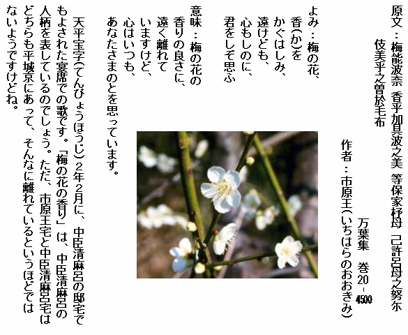 巻20-4500: 梅の花香をかぐはしみ遠けども心もしのに君をしぞ思ふ