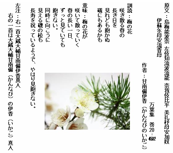 巻20-4502: 梅の花咲き散る春の長き日を見れども飽かぬ礒にもあるかも