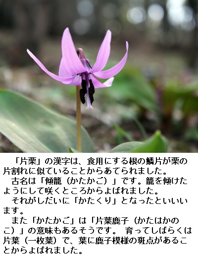 堅香子(かたかご)は、カタクリと言われています。ユリ科のコバイモという説もあるそうですが、ここでは、カタクリとして説明します。片栗(かたくり)はユリ科の多年草です。山林の中に生える小さな(高さ、15センチほど)花です。3月~4月にかけて、紫がかったピンクの花びらの可憐な花を咲かせます。片栗粉の材料として有名ですが、今ではほとんどの片栗粉はジャガイモの澱粉(デンプン)から作られます。