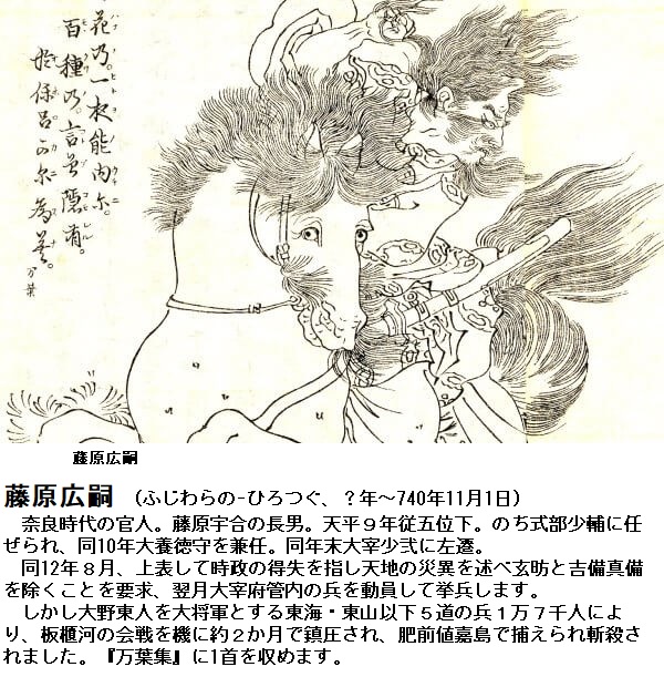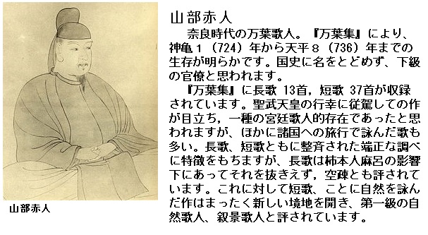奈良前期の官人・歌人。藤原宇合(うまかい)の下僚と思われます。「高橋虫麻呂歌集」があり、伝説に取材した歌が多く万葉集に収められています。一説に「常陸風土記」の撰に関与したといわれています。