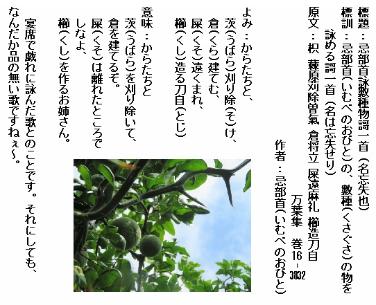 巻16-3832:からたちと茨刈り除け倉建てむ屎遠くまれ櫛造る刀自