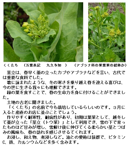 茎立(くくたち)は、菜薹(とう)のたったカブ、アブラナなどの菜のことを言うようです。古代の食料として重要だったようです。