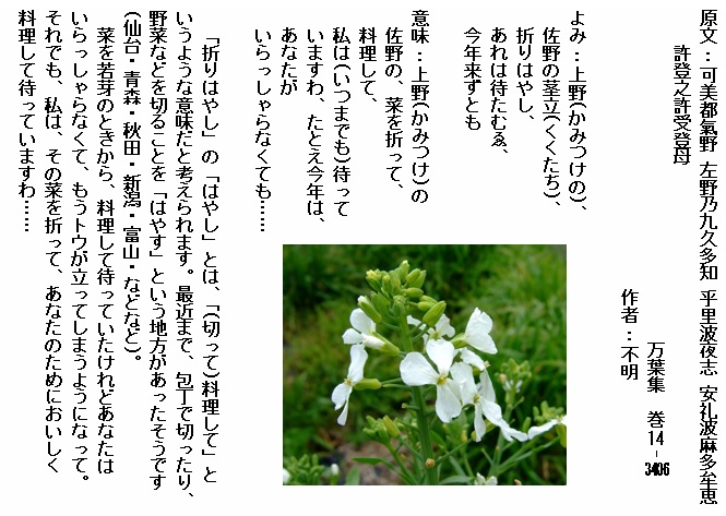 巻14-3406: 上野の佐野の茎立折りはやしあれは待たむゑ今年来ずとも
