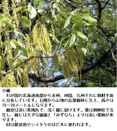 小楢(こなら)は、ブナ科コナラ属のの落葉高木です。15メートルくらいのものもあります。薪(たきぎ)、炭、家具などに使われます。5月頃に黄色い花を垂れ下げるように咲かせます。