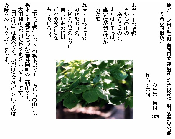 巻14-3424: 下つ毛野みかもの山のこ楢のすまぐはし子ろは誰が笥か持たむ