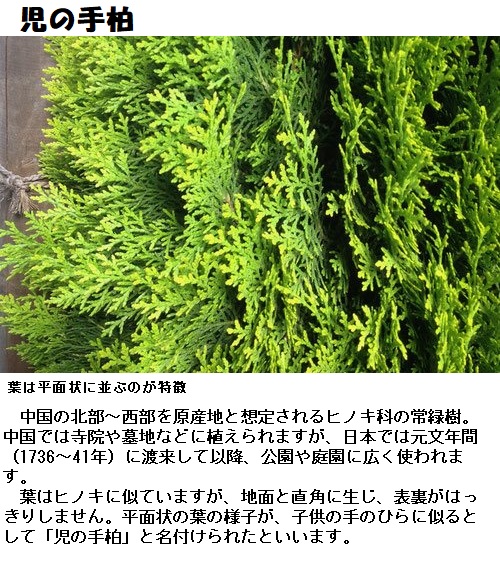 現在の「児の手柏(このてかしわ)」は、江戸時代に日本に来たという説があります。他の説としては、次のようなものがあります。