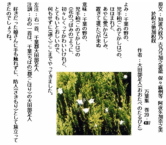 巻20-4387: 千葉の野の児手柏のほほまれどあやに愛しみ置きて誰が来ぬ