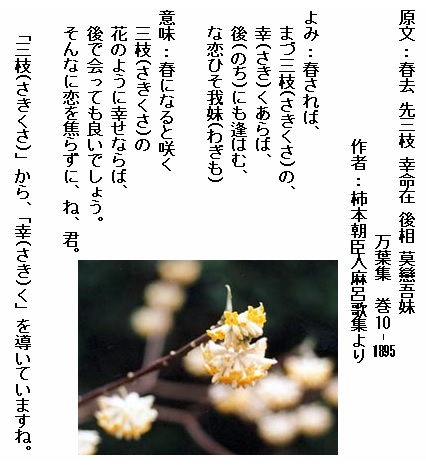 三枝(さきくさ)が何なのかははっきりしていません。三椏(みつまた)、福寿草(ふくじゅそう)、沈丁花(じんちょうげ)などの説があります。ここでは、三椏(みつまた)として説明します。