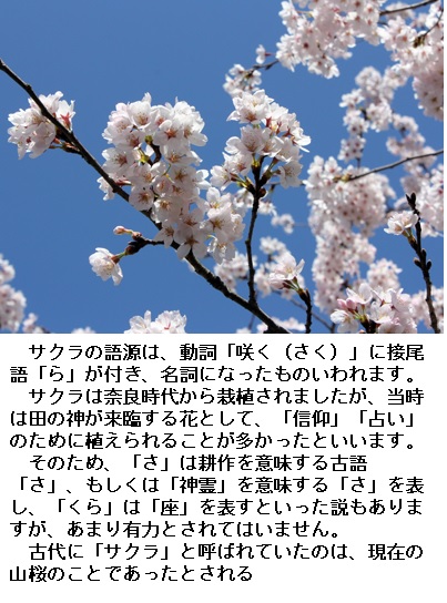 ちなみに、桜(さくら)の語源の一つの説として、「さ」が田の神、「くら」は神の座(くら)のことだという説があります。