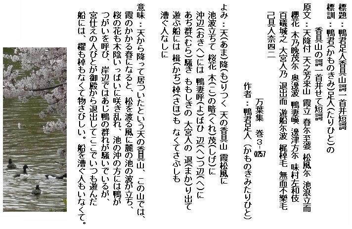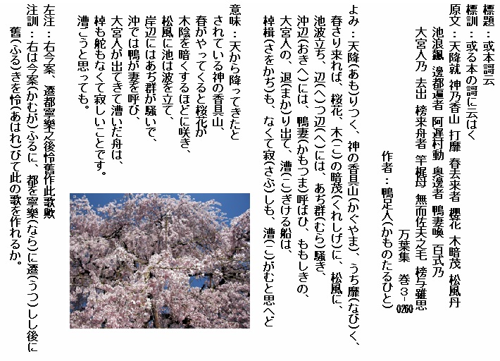 巻3-0260: 天降りつく神の香具山うち靡く春さり来れば桜花.......(長歌)