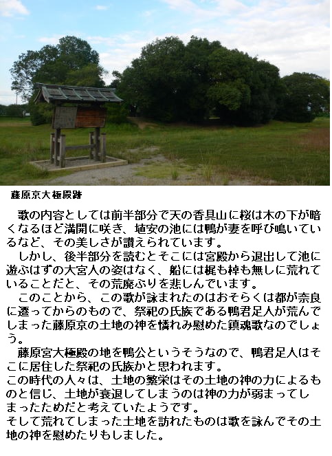 鴨君足人についてははっきりしたことは分かりませんが、藤原宮大極殿の地を鴨公というそうなので、そこに居住した祭祀の氏族かと思われます。