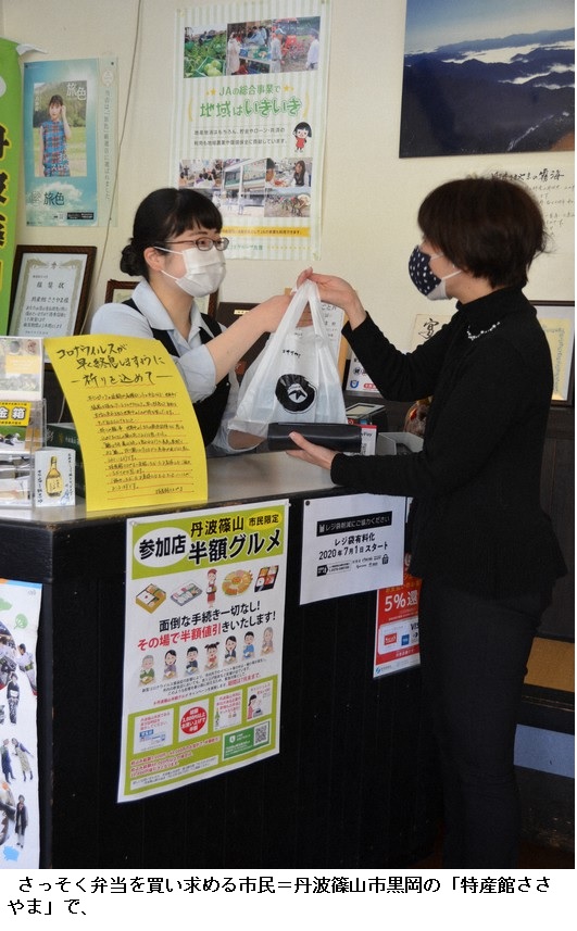 持ち帰り弁当など半額補助 名産牛ステーキも 兵庫・丹波篠山市 ―― 新型コロナウイルス感染拡大を受け、市民が弁当などの持ち帰り食品を購入する場合に半額を補助する丹波篠山市の「丹波篠山半額グルメ」が20日から始まった。食品の販売を促進することで、消費者と事業者双方を支援する。約50店の参加を見込んでおり、実施は7月末まで。